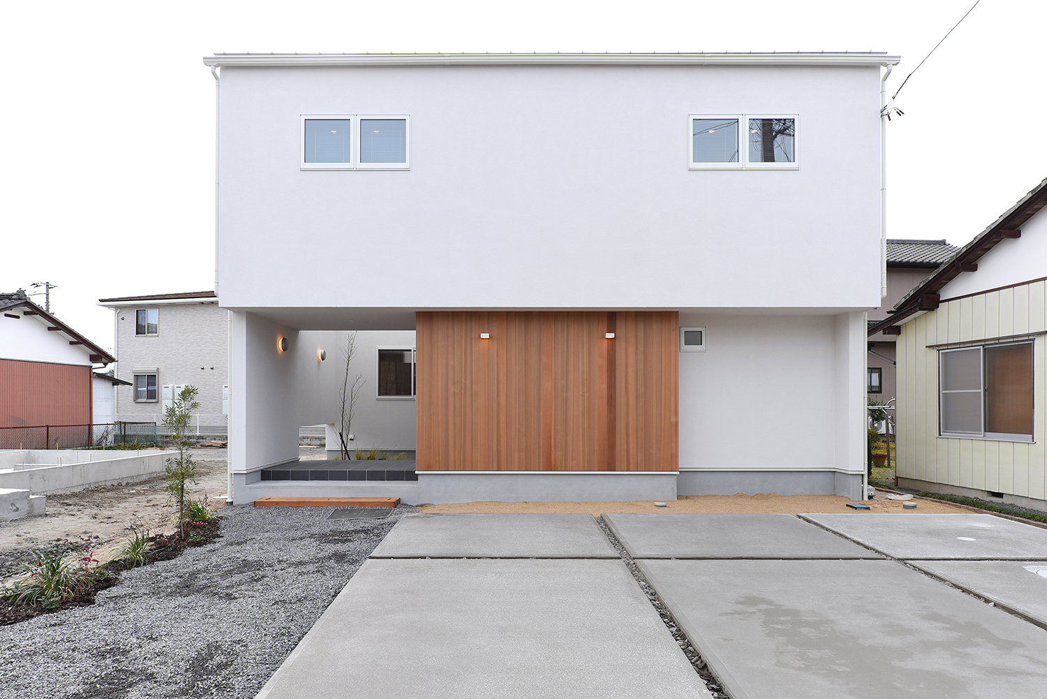 キュービックな外観がモダンなイメージ。レッドシダー縦張りのアクセントで、周囲に和らぎを。