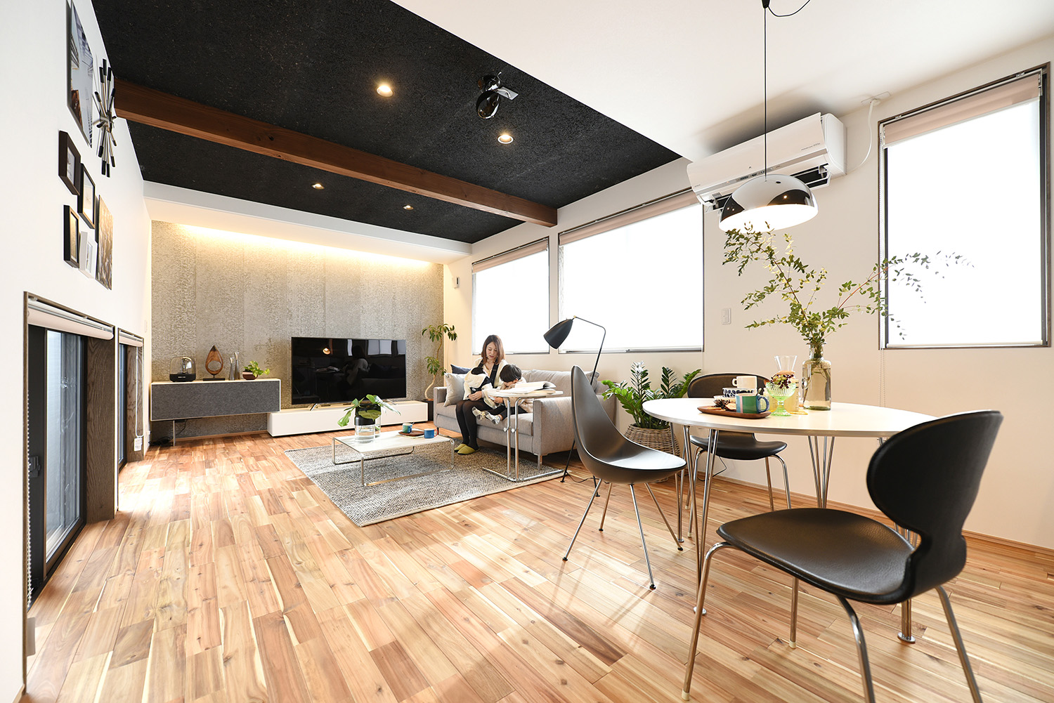 天井には木毛セメント板を黒く塗装したものを用いるなど、インダストリアルテイストながら温かみのある素材使い。