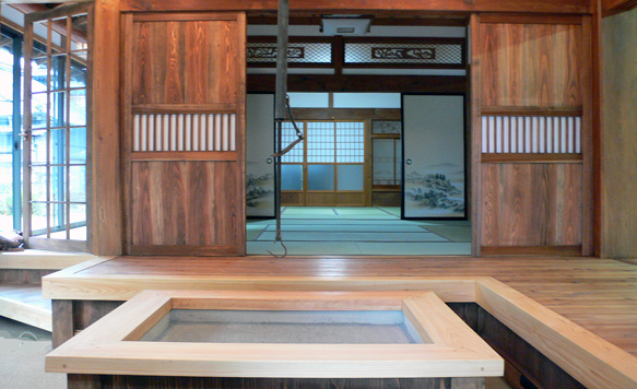 24囲炉裏まわりはほとんど新しい材料です。床板の「あつ密すぎ24」と杉材の建具が古民家に合うので雰囲気を崩しません。